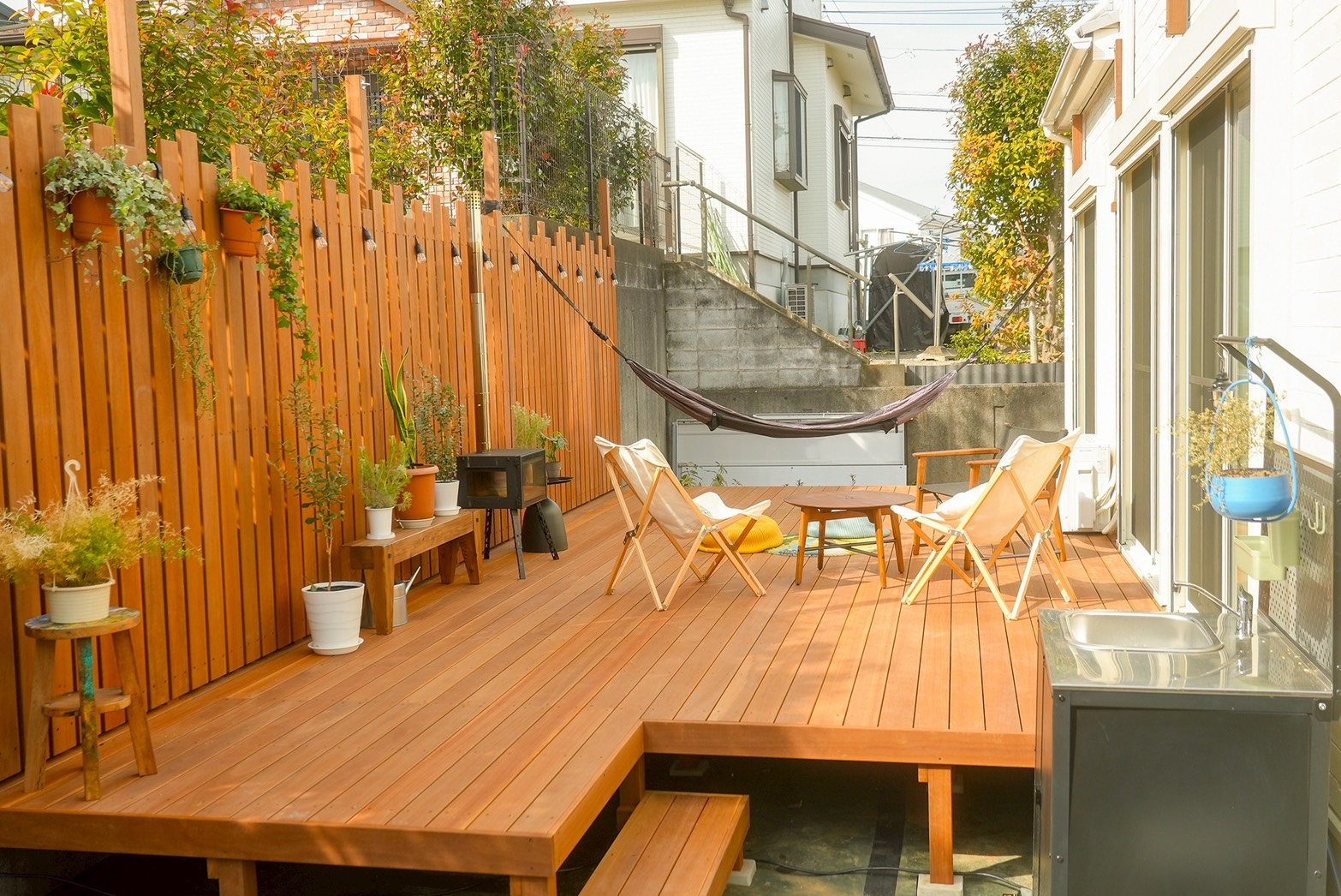 お庭、ガーデン、テラス、ベランダ、バルコニー。ウッドデッキは、家族の生活に温もりと幸せをもたらします。